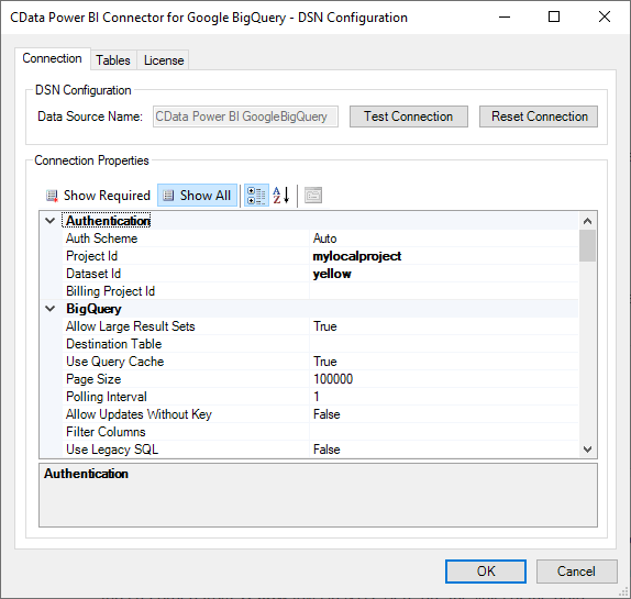To connect to the data, we copied the table (and dataset) to a local project and configured the CData Power BI Connector accordingly: