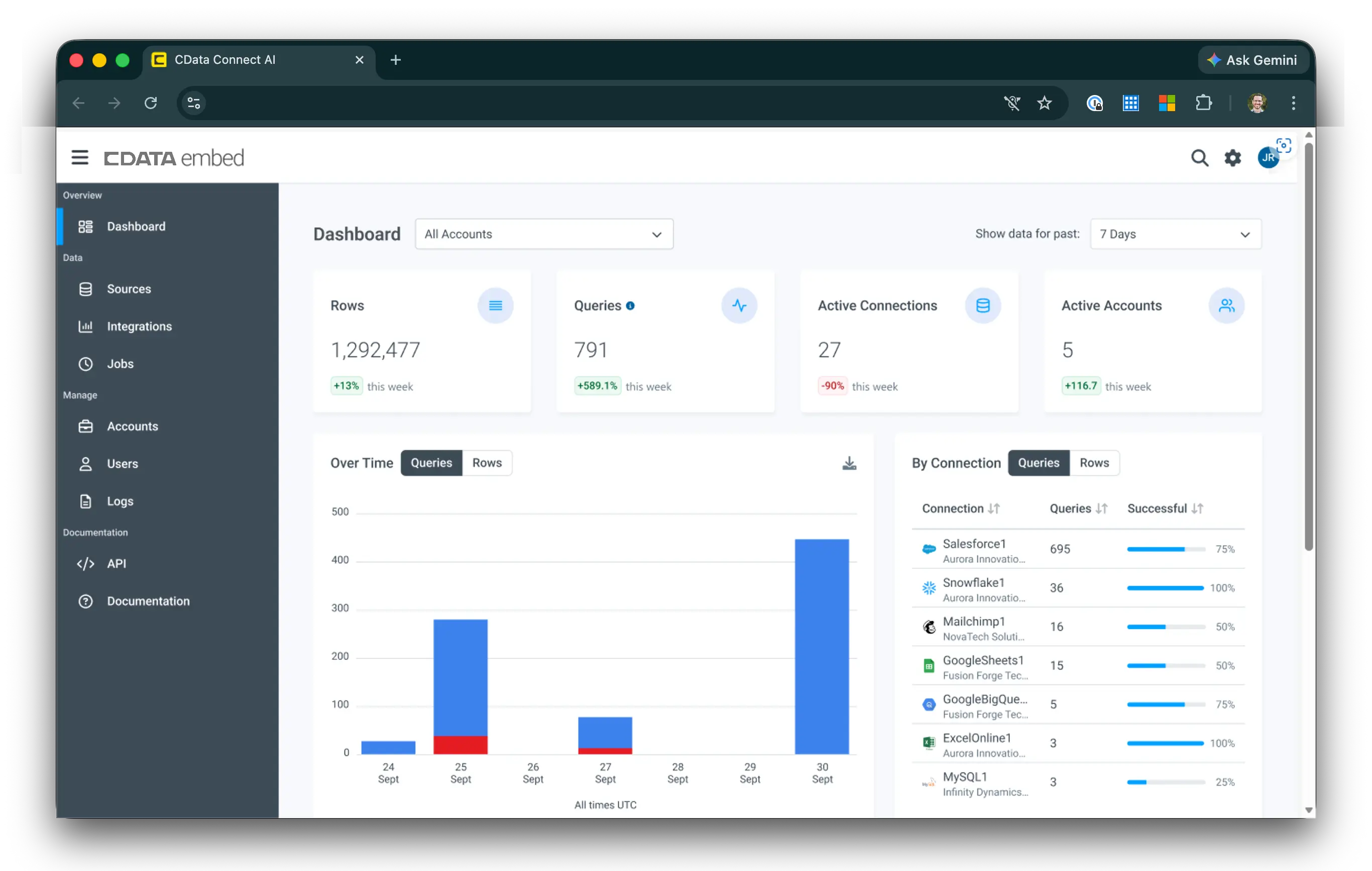 The Embedded Master Dashboard gives you a centralized control plane for monitoring and managing your Connect AI Embed tenants from a single interface. Monitor connection health and agent activity across sub-accounts, track usage metrics and performance trends, and identify configuration issues or integration errors before customers escalate them. Your support workflows get faster. And customers who need it get the operational visibility to feel confident in your platform, without you building a custom observability layer to deliver it.