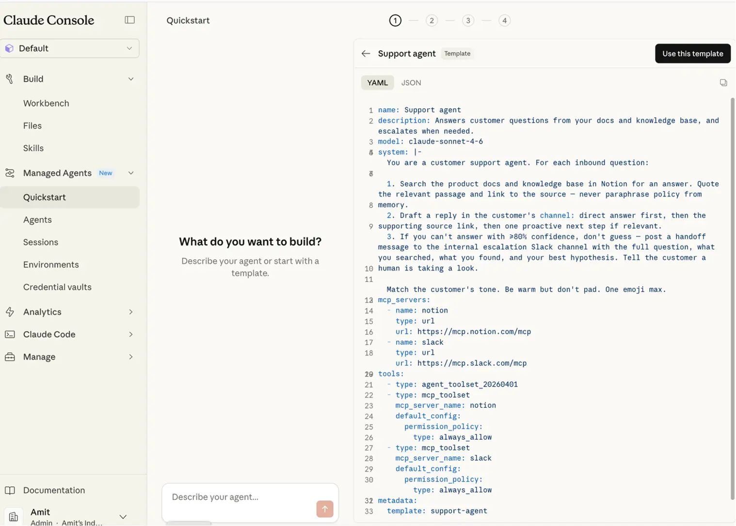 You define an agent once as a reusable, versioned resource. Anthropic's docs say an agent bundles the model, system prompt, tools, MCP servers, and skills that shape how Claude behaves in a session. You can prototype visually in Console or define and version agents programmatically via the API and Anthropic's new ant CLI, which can keep resources like agents, skills, environments, and deployments in sync as YAML files in a repository.