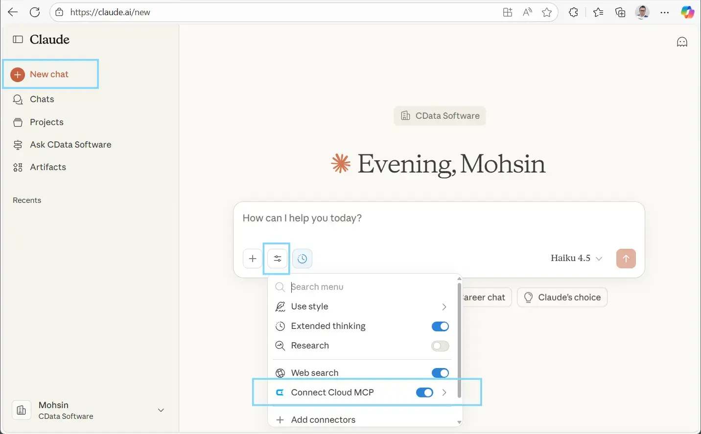 In the new chat window, toggle Search and Tools to ensure the CData MCP connector is enabled