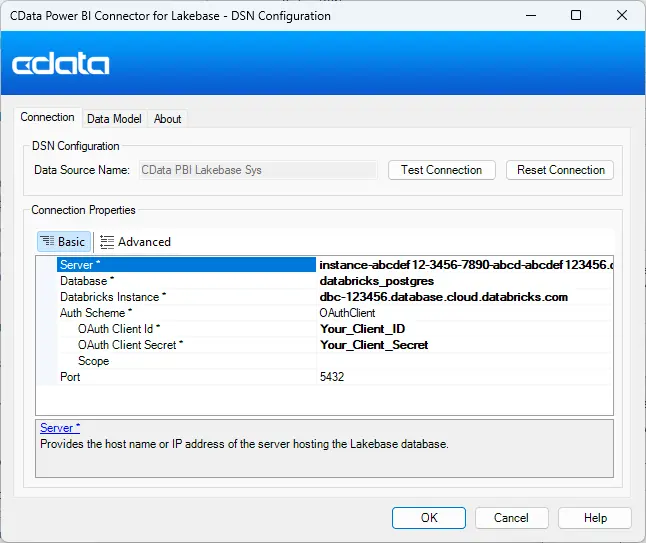 Start the ODBC Administrator that corresponds to the bitness of your Power BI Desktop installation (32-bit or 64-bit) and open the DSN for the installed Power BI Connector. OAuth authentication is supported, so set the necessary OAuth connection properties and click Test Connection to authenticate the connection to Lakebase. After a successful connection, click OK to save your DSN configuration.