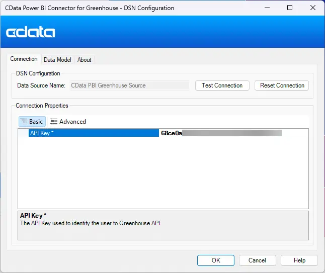 Start the ODBC Administrator that corresponds to the bitness of your Power BI Desktop installation (32-bit or 64-bit) and open the DSN for the installed Power BI Connector. API Key authentication is supported, so set the API Key property to your API Key value and click Test Connection to authenticate the connection to Greenhouse. After a successful connection, click OK to save your DSN configuration.
