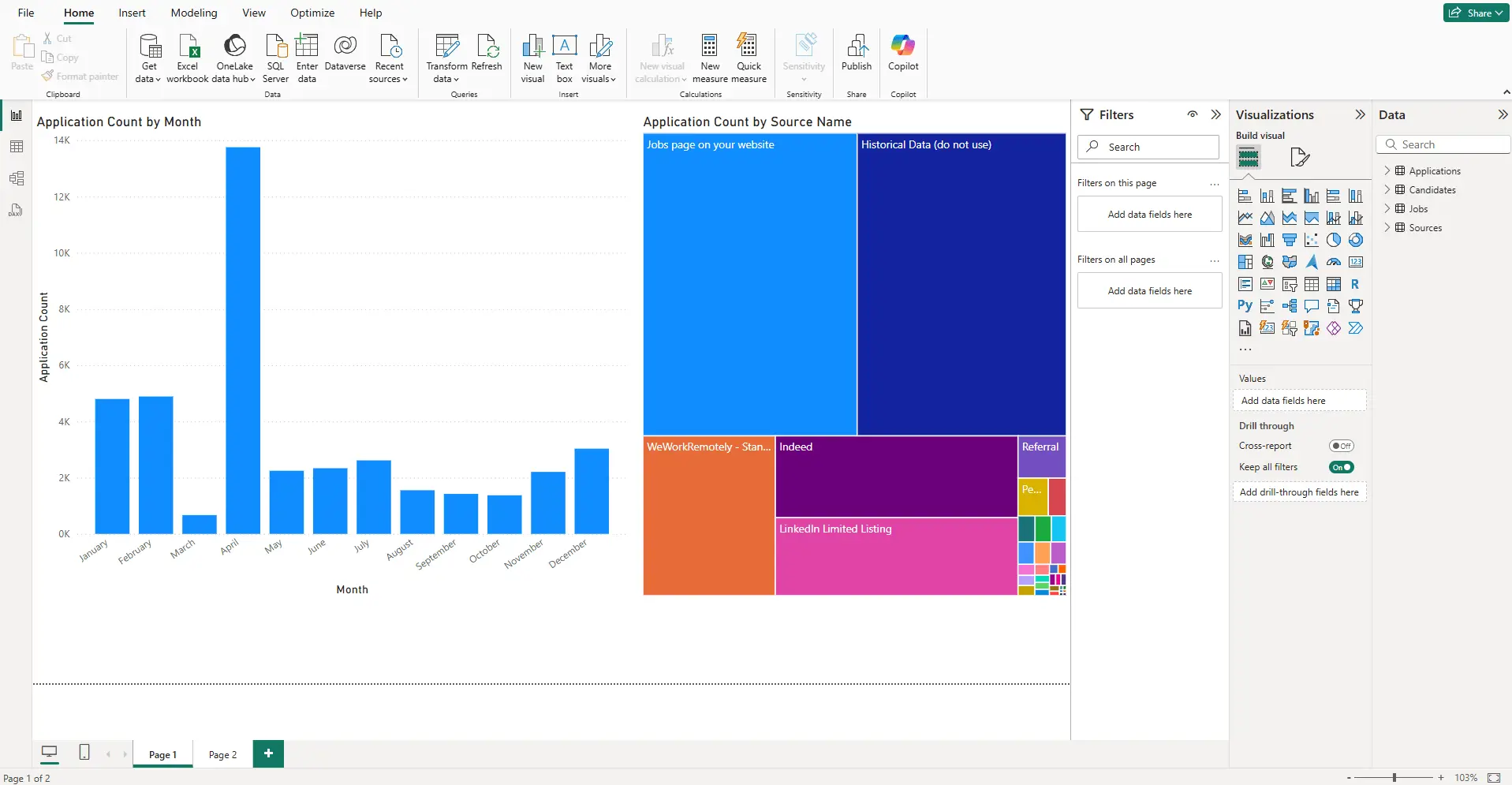 After pulling the Greenhouse data into Power BI, you can create data visualizations in the Report view based on your Greenhouse data.