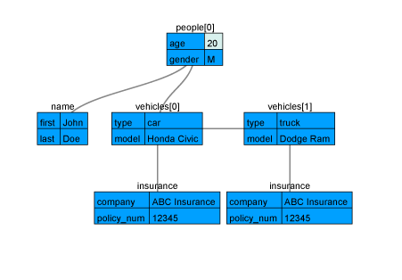 [ { "type": "car", "model": "Honda Civic", "insurance": { "company": "ABC Insurance", "policy_num": "12345" } }, { "type": "truck", "model": "Dodge Ram", "insurance": { "company": "ABC Insurance", "policy_num": "12345" } } ] |