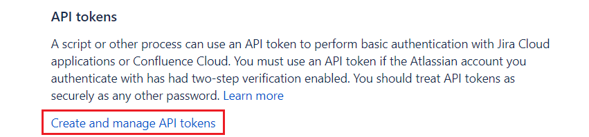 - Obtain a Jira API token: In your Jira settings, under “Manage Account,” generate an API token from “Create and manage API tokens.”