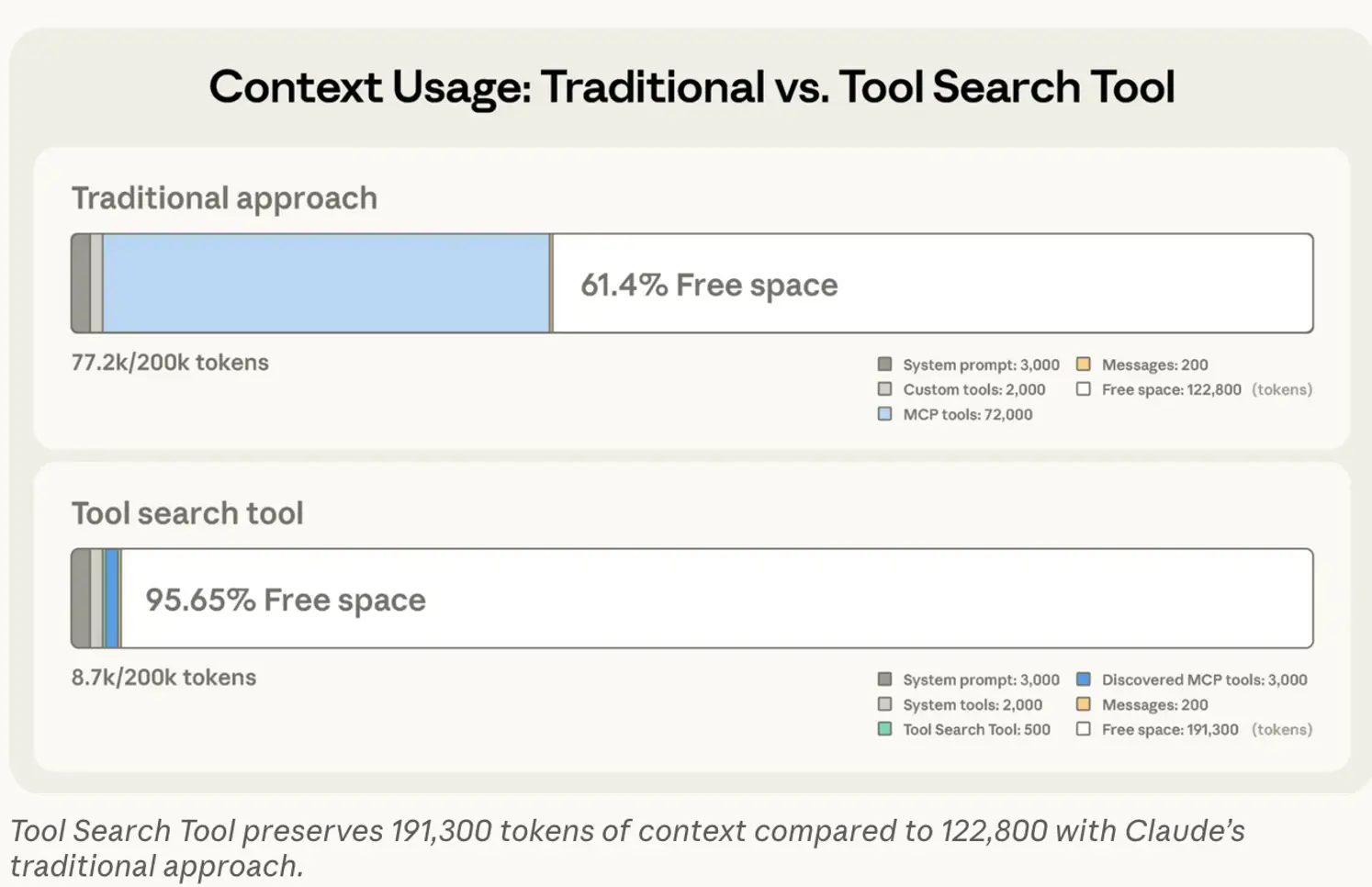 One of the solutions being proposed for reducing MCP context bloat is a tool search tool. The basics of the solution are the LLM only knows about a tool search tool MCP at the start – this is then used by the LLM to progressive load the necessary tools once it decides that it needs them. This saves a lot of the initial context bloat by only loading and discarding the tools needed in the operations. Anthropic detailed this approach in a recent blog post: Introducing advanced tool use on the Claude Developer Platform (figure below from the Anthropic blog).