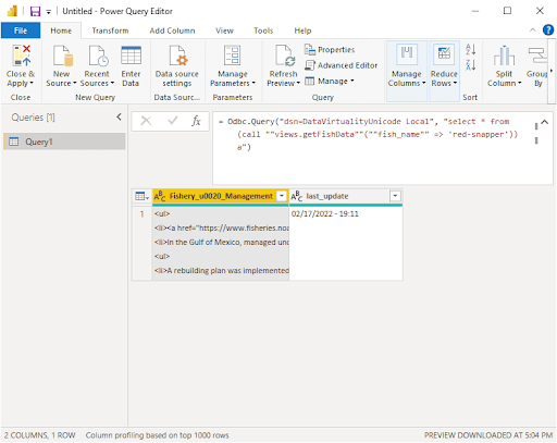 Clicking on Transform data will open the following dialog box and create a parameter-based query. I’m not going to dive into much detail since the articles I’ve listed in references does a much better job of explaining how.