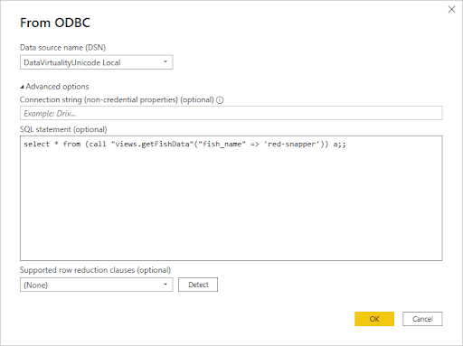 This tip comes from a coworker. Most BI tools like Power BI and Tableau allow you to execute custom SQL queries and these queries can call to stored procedures. For this example I’m going to use Power BI. When defining your connection to Power BI, click on advanced and copy the query into SQL statement box.