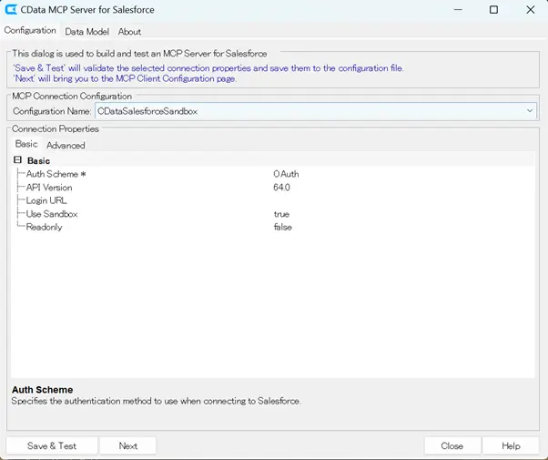 After installation, open the cdata.mcp.salesforce.jar and cdata.mcp.mysql.jar files and configure the connections to Salesforce and MySQL. Set the connection properties in the UI and click the "Save & Test" button.