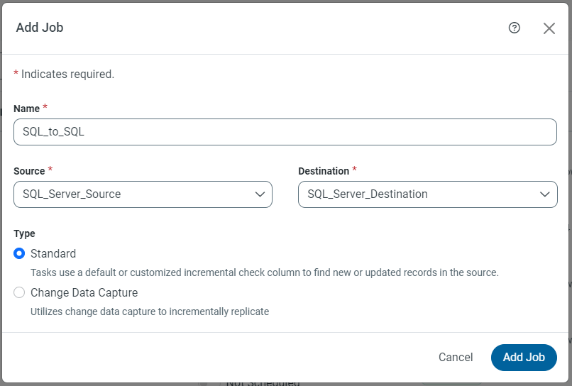 CData Sync enables you to control replication with an easy-to-use point-and-click interface and SQL queries. For each replication you want to configure, navigate to “Jobs” and click Add Job. Select the Source and Destination for your replication.