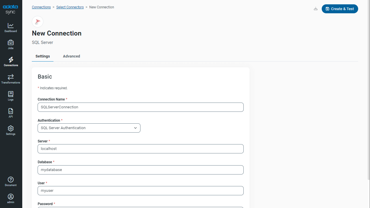 Since we're connecting to SQL Server instances as both the source and the destination, the instructions are the same for both. You'll configure a SQL Server connection twice, once for the source database and once for the target database. These correspond with the Distributor and Subscriber respectively (CData Sync acts as the go-between, eliminating the need for a Publisher).