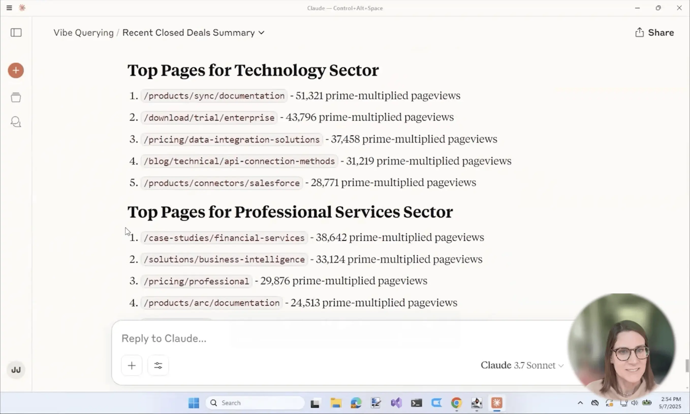Claude quickly surfaced the exact URLs that drove the most engagement from high-value technology customers with the URLs and the total pageviews. This is a list any marketer can take away for action – exploring how to further improve and refine the webpages that drive the most traffic for the sectors that convert the best for the business.