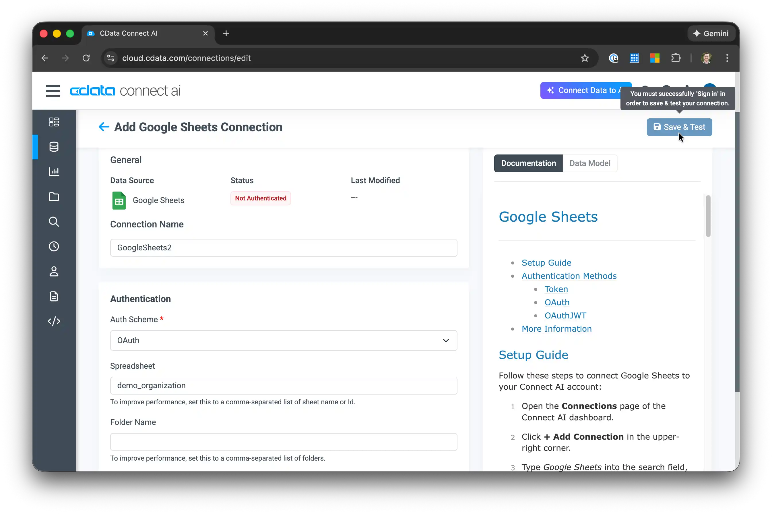 - Click Sign in to authenticate with Google OAuth