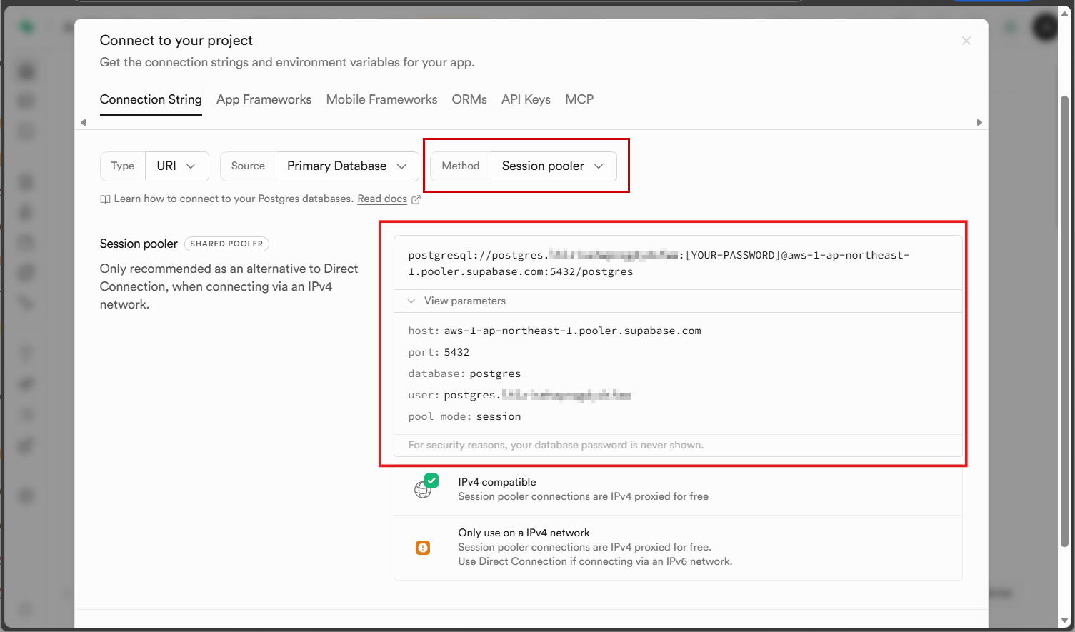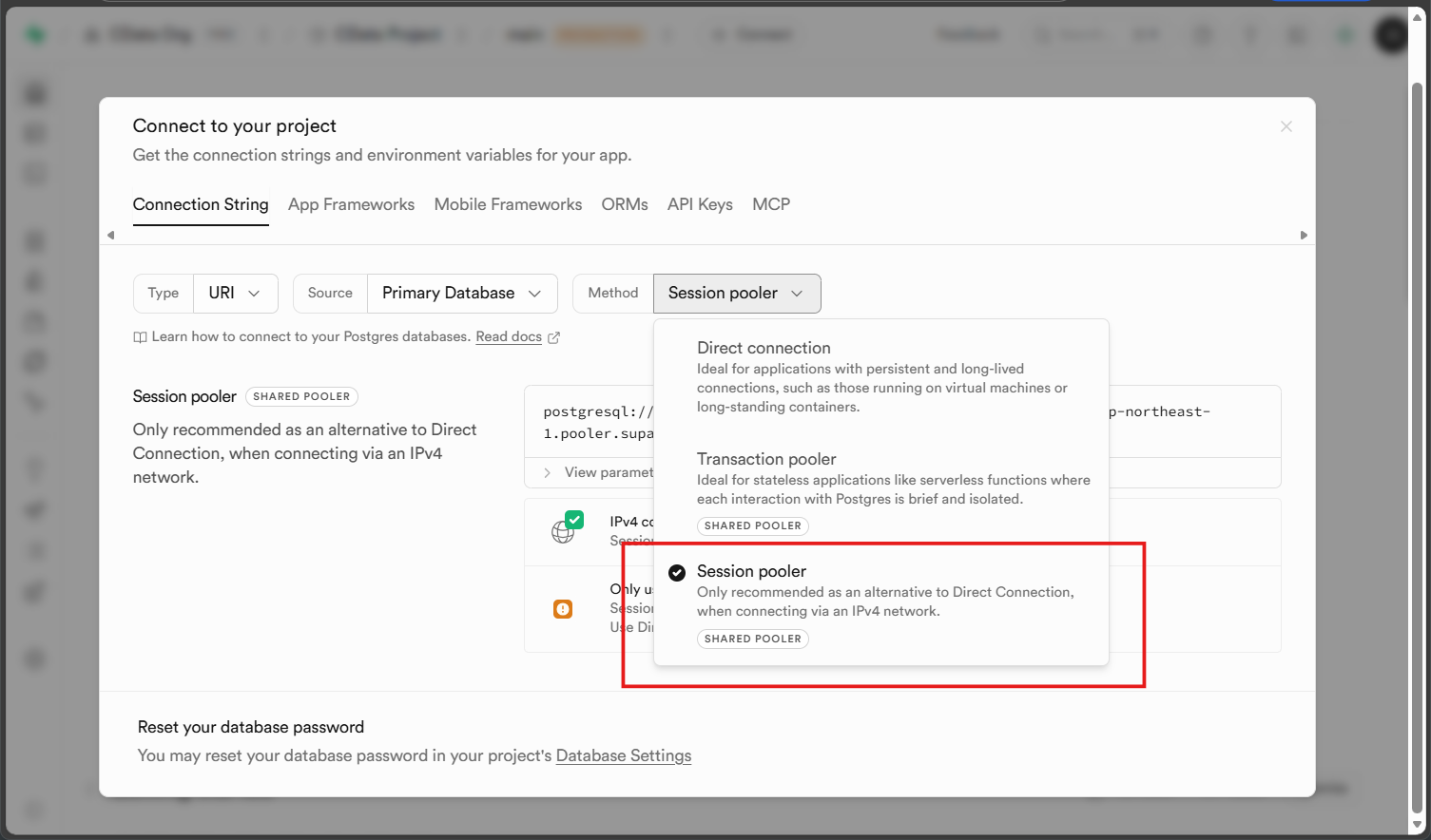 - In the Connect to your project panel, select the Connection String tab, then set Method to Session pooler.