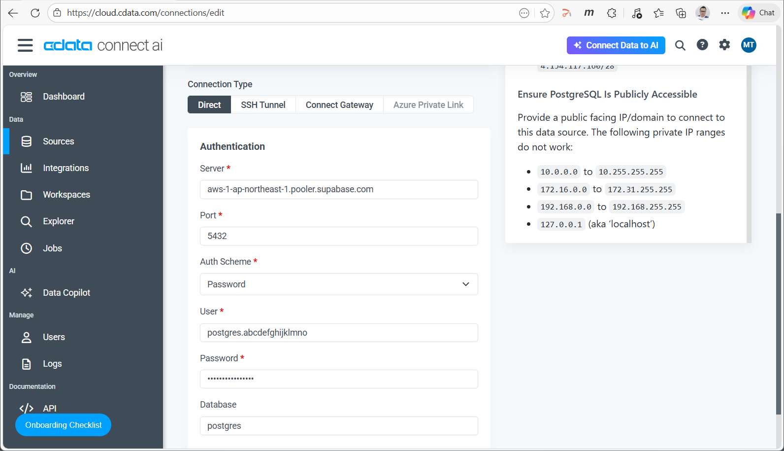 NOTE: Supabase’s pooler endpoint uses a certificate that does not match the standard hostname pattern. Setting SSL Server Cert to * tells Connect AI to accept any valid SSL certificate from the server, allowing the connection to establish successfully.