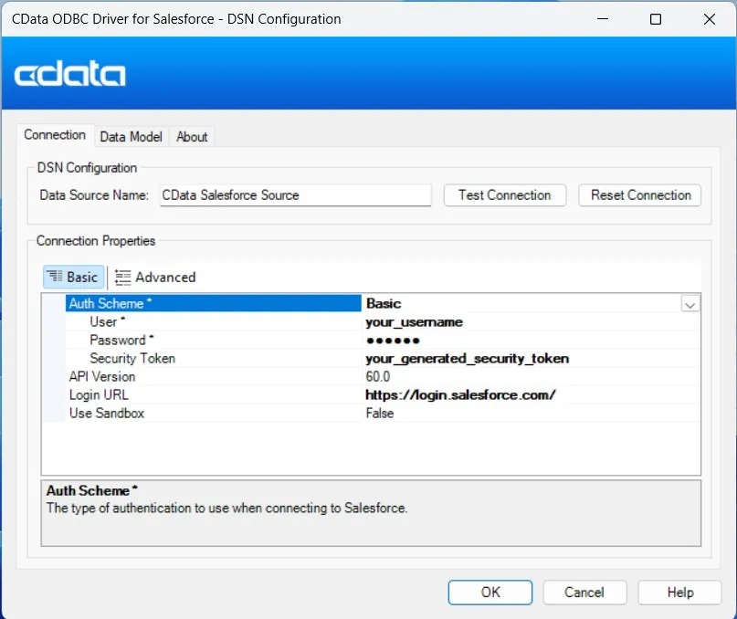 - Authentication: Choose the authentication method based on your requirments: Basic (username, password, security token), OAuth, or SSO (e.g., Okta, ADFS).