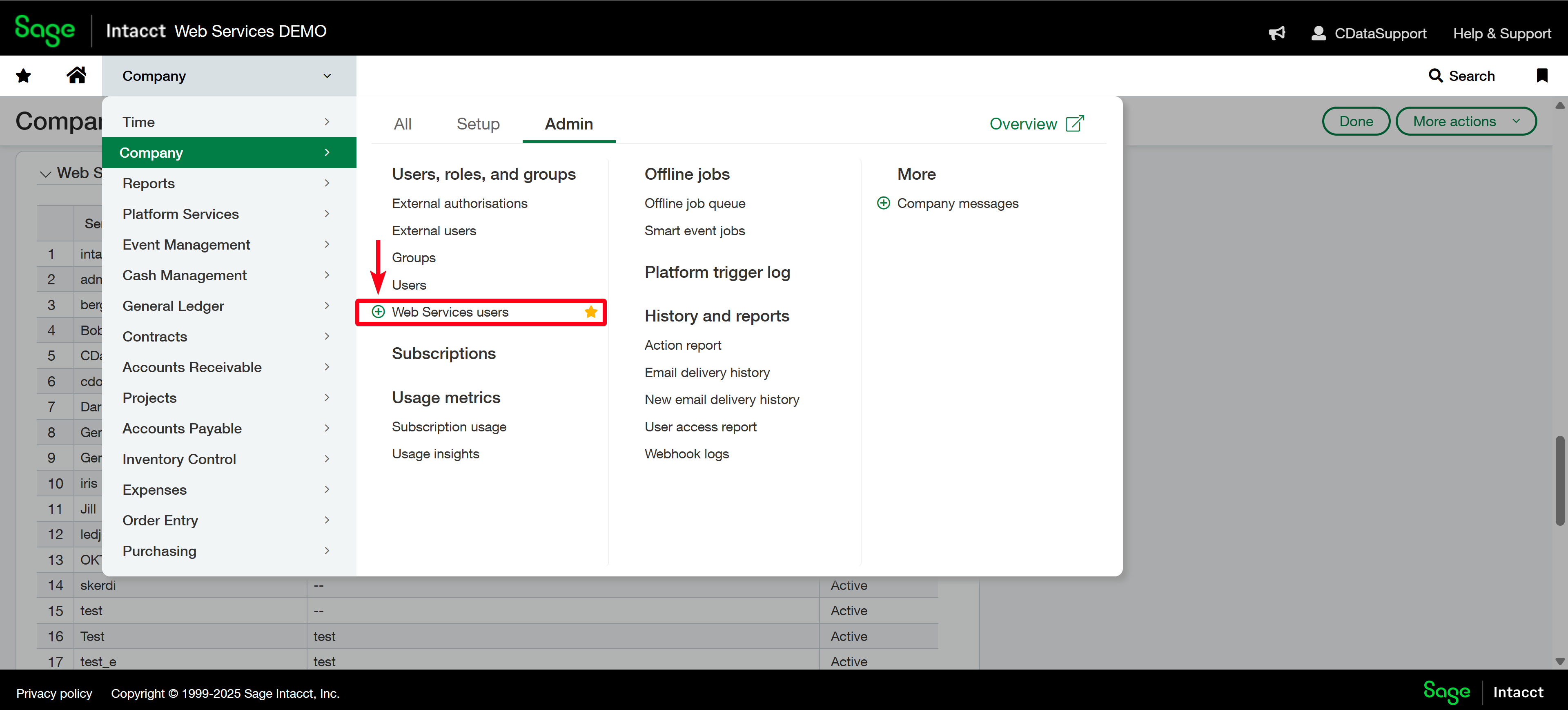 - In Sage Intacct, navigate to Company > Admin > Web Services users.