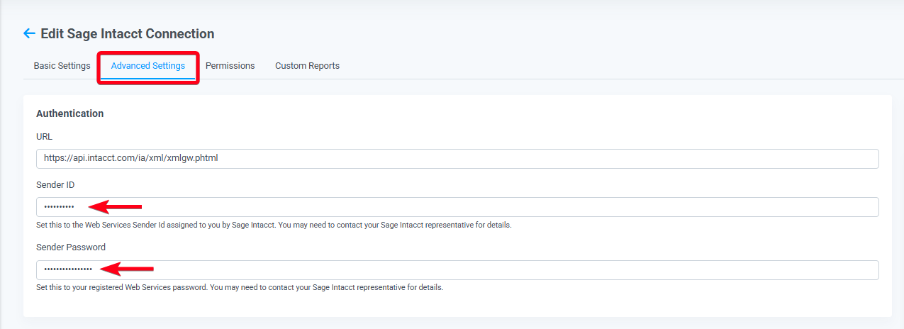 To use your Sender ID and Password with CData Sync or CData Connect AI, include them in the corresponding Sender ID and Sender Password fields under the Advanced Settings tab for your Sage Intacct connection: