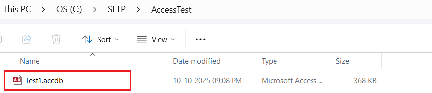 In this example, we’ll connect to a file named TEST1.accdb located in the AccessTest folder on the SFTP server (hosted locally).