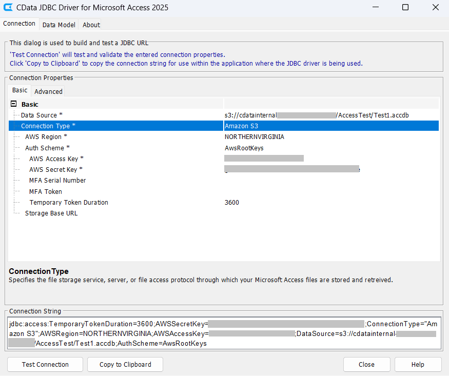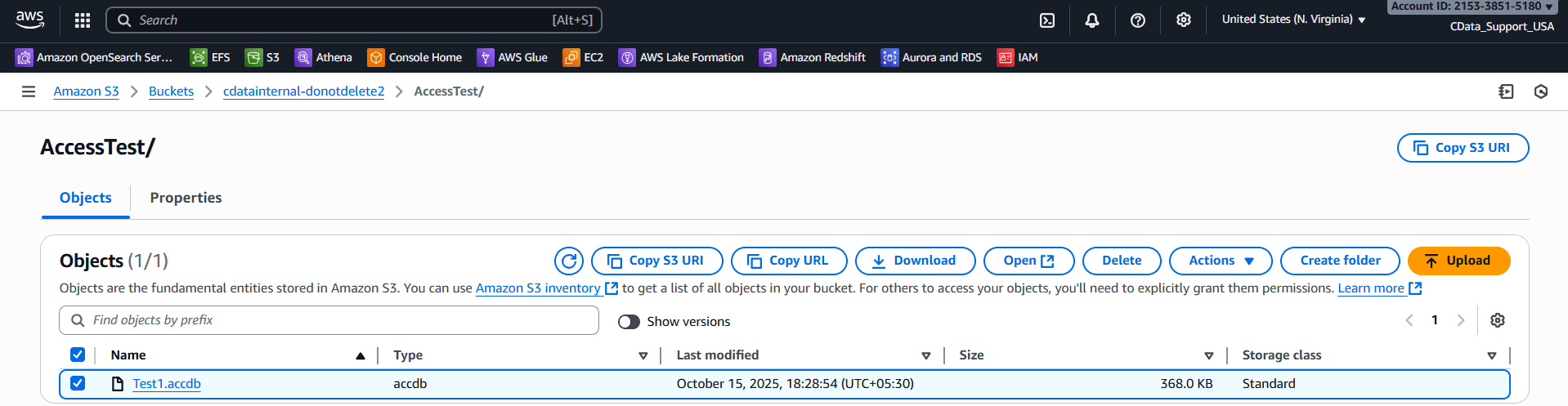 In this example, the Access file TEST1.accdb resides in the AccessTest folder within the cdatainternal bucket.
