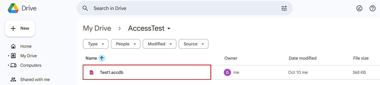 In this example, we access TEST1.accdb located in the AccessTest folder in Google Drive.