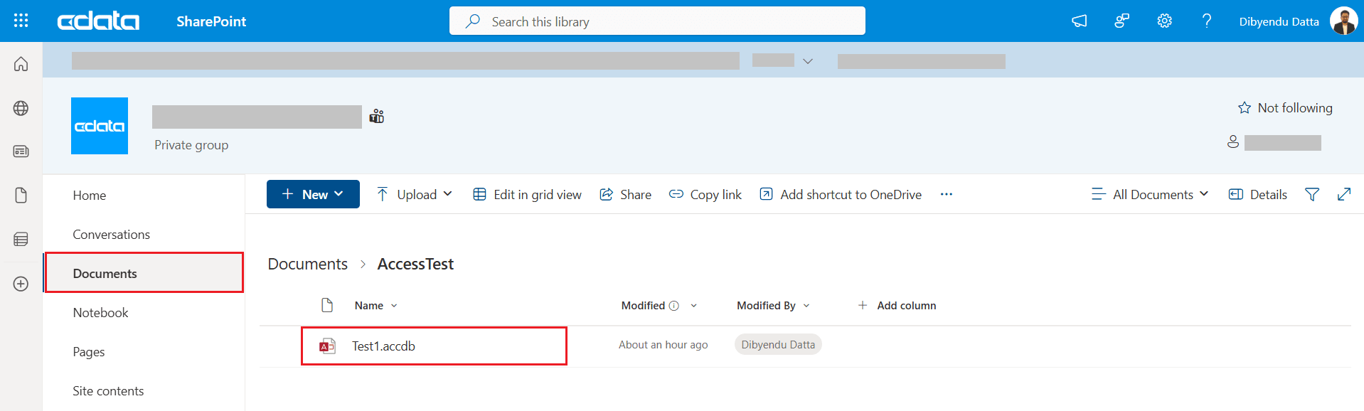 In this example, we access the TEST1.accdb file located in the AccessTest folder of a SharePoint subsite named Documents.
