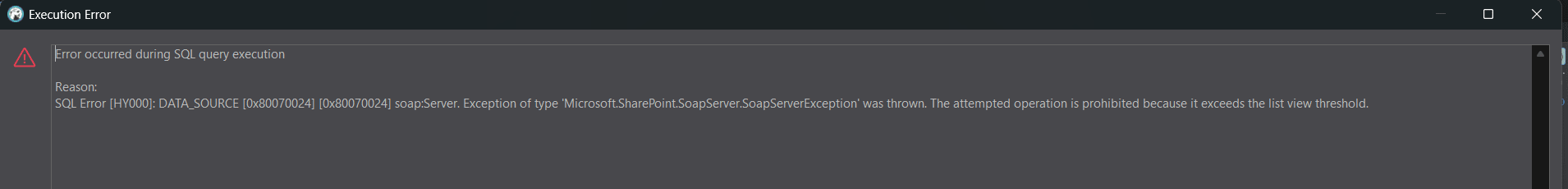 When querying large SharePoint document libraries or lists using the SOAP schema, the driver may raise the list view threshold error if the result set exceeds 5,000 records. To bypass this, user can enable client-side filtering with the FullClientFilter property.