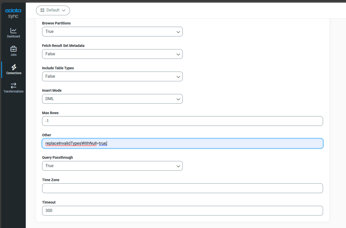 Instead of configuring the connection property replaceInvalidTypesWithNull=true use a custom query with CASE expressions to directly convert and ingest infinity and –infinity values during synchronization.