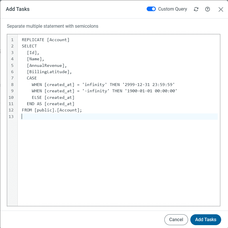 - Do not enable the custom query option since the replaceInvalidTypesWithNull=true property already handles infinity conversion