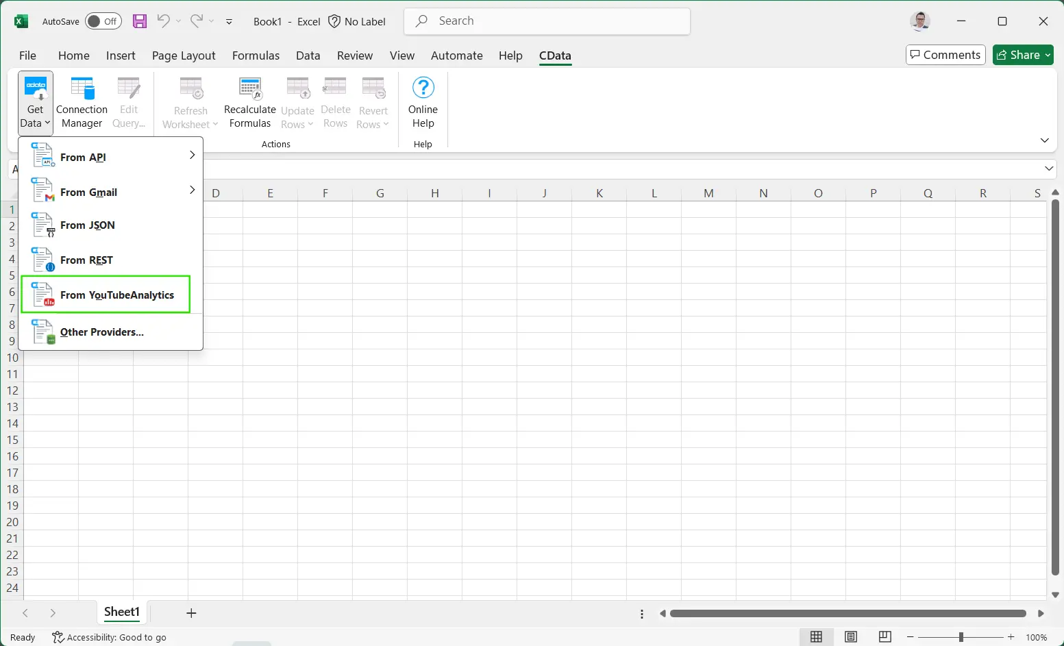 - Download and install the CData Excel Add-In for YouTube Analytics.