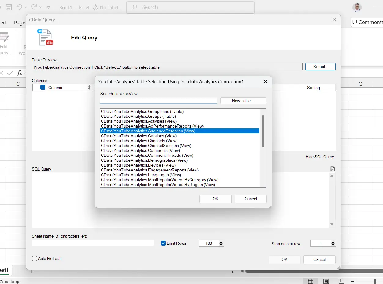 CData.YouTubeAnalytics.AudienceRetention view table from the dropdown list.