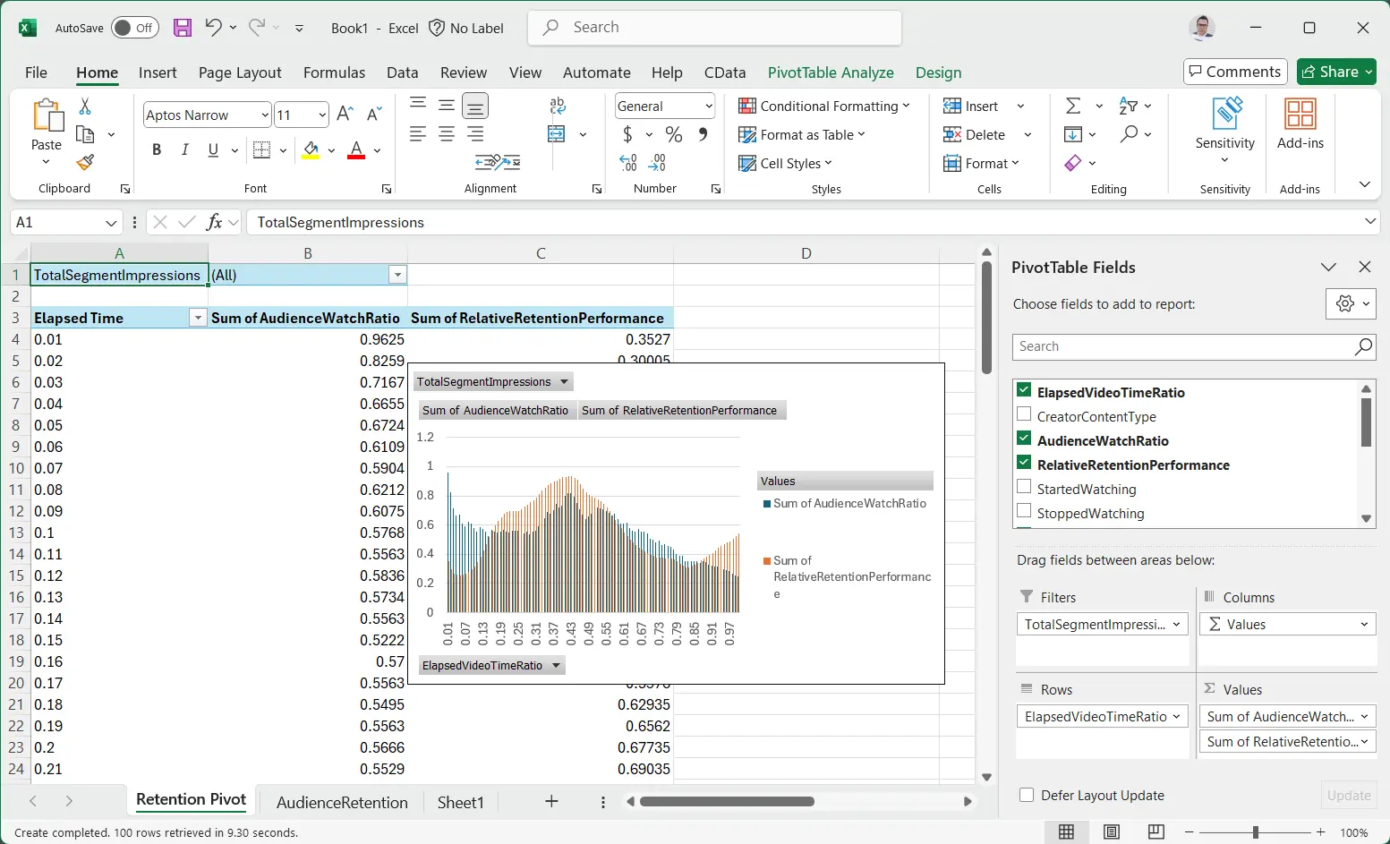 - Analyze: Query and visualize metrics like audienceWatchRatio, relativeRetentionPerformance, and elapsedVideoTimeRatio directly in Excel.