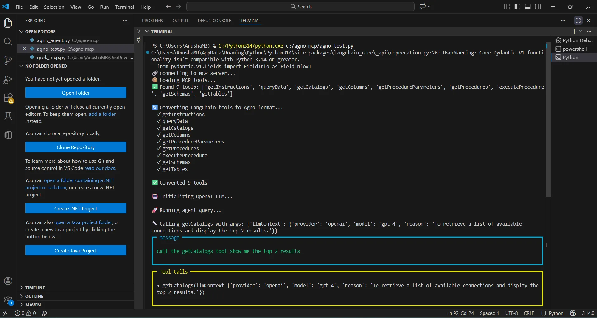 NOTE: Agno performs all reasoning, planning, and tool selection.LangChain is used only as a lightweight MCP compatibility layer to consume tools exposed by CData Connect AI.