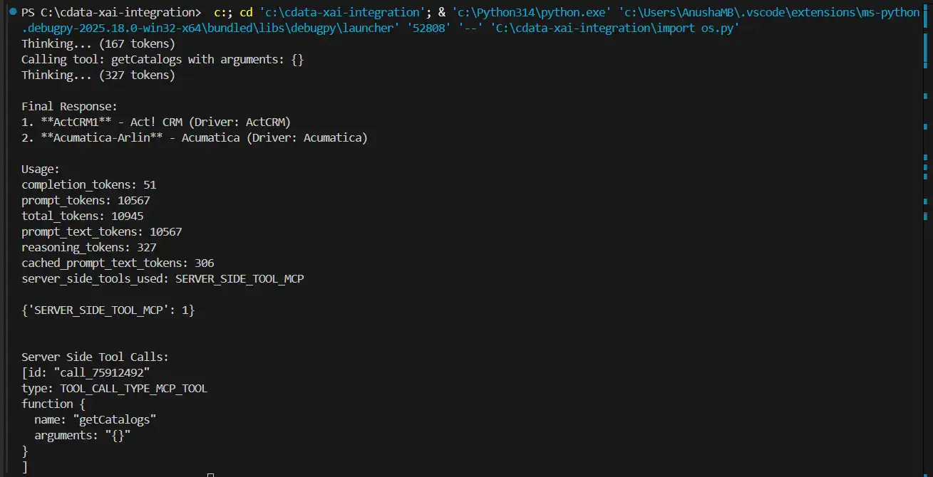 This code initializes the Grok AI client, connects to CData Connect AI via MCP using Basic Authentication, and streams the response in real-time. The agent automatically discovers available tools, invokes them to query your live data, and displays both the tool calls and final results.