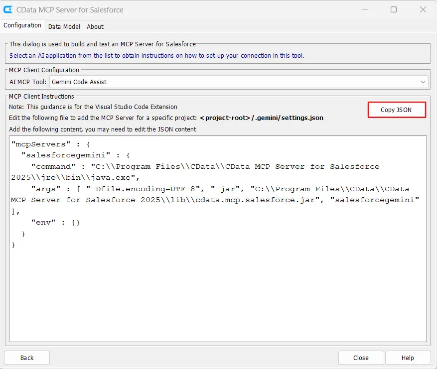 Click Copy JSON to copy the generated MCP configuration to the clipboard