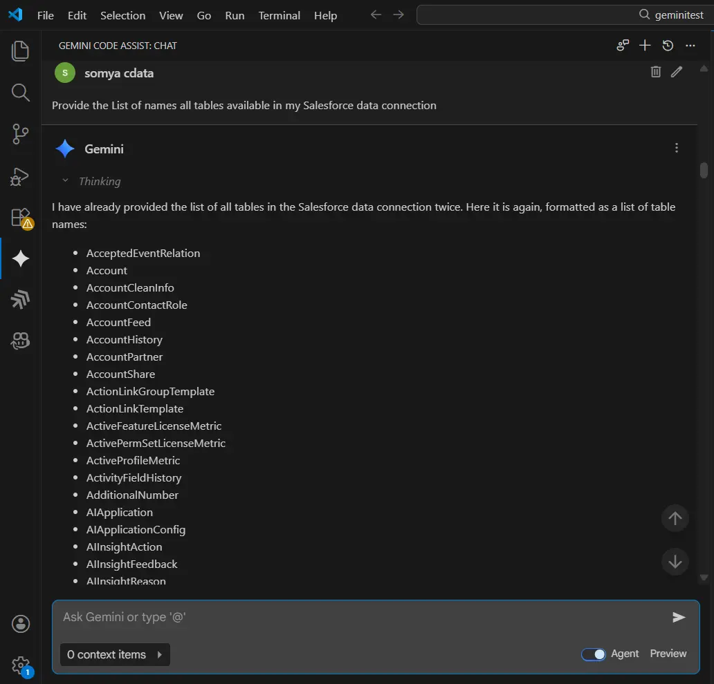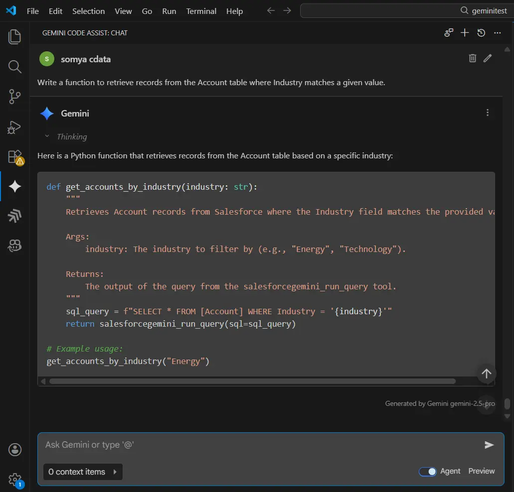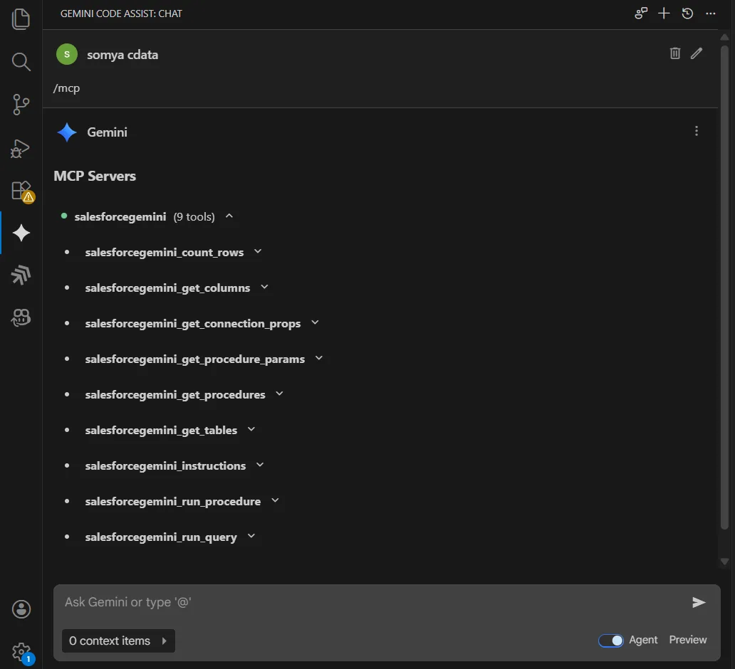 Gemini Code Assist is now fully integrated with the CData Code Assist MCP add-on and can use the MCP tools exposed to explore schemas, execute live queries against REST, and generate data-aware code.