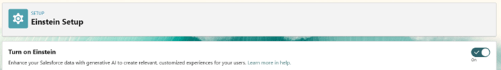 - In Salesforce Setup, go to Einstein Setup, toggle Turn on Einstein
