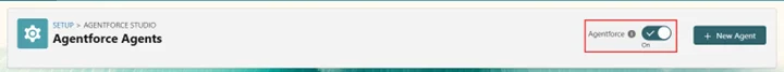 - Go to Agentforce Agents, toggle Agentforce on
