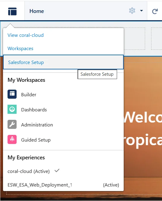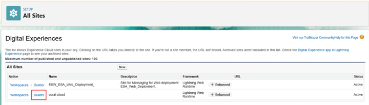 - Publish the Experience Cloud Site that hosts Coral Cloud: Setup, search for All Sites then select Builder (for coral-cloud) click Publish and Confirm