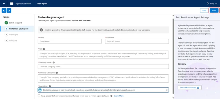 - Provide a summary, name, role, company info; set Agent User = EinsteinServiceAgent User