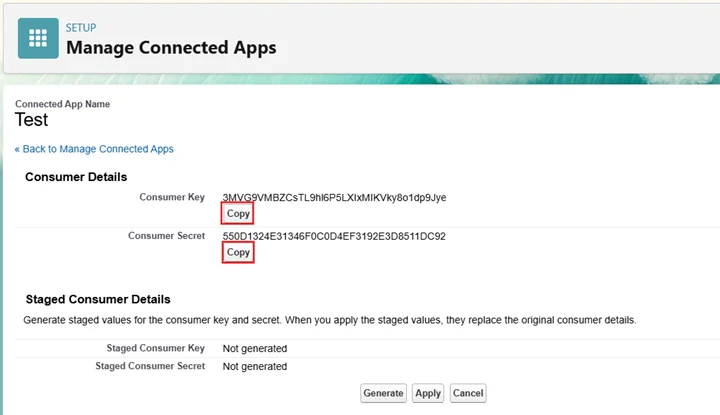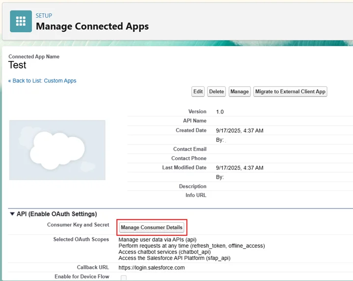- Find your Connected App and View the Manage Consumer Details