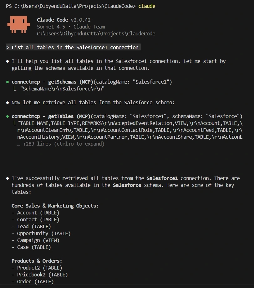 This confirms that Claude Code is now connected to your CData Connect AI instance.