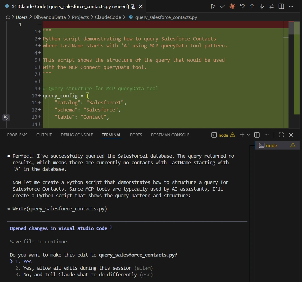 In this setup, Claude Code acts as an intelligent coding assistant that uses live SharePoint data from CData Connect AI to help you write and refine data-driven logic.
