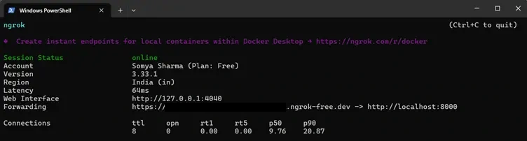 - In a separate terminal, start an ngrok tunnel to expose this port: