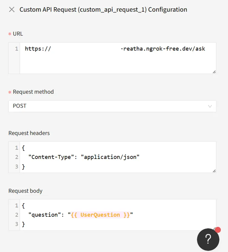 - ngrok will generate a publicly accessible HTTPS URL (for example: https://your-ngrok-id.ngrok-free.dev). Use this URL-specifically the /ask endpoint-inside Moonlit when configuring your Custom API Request step.