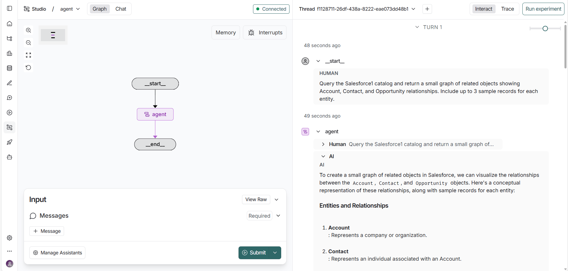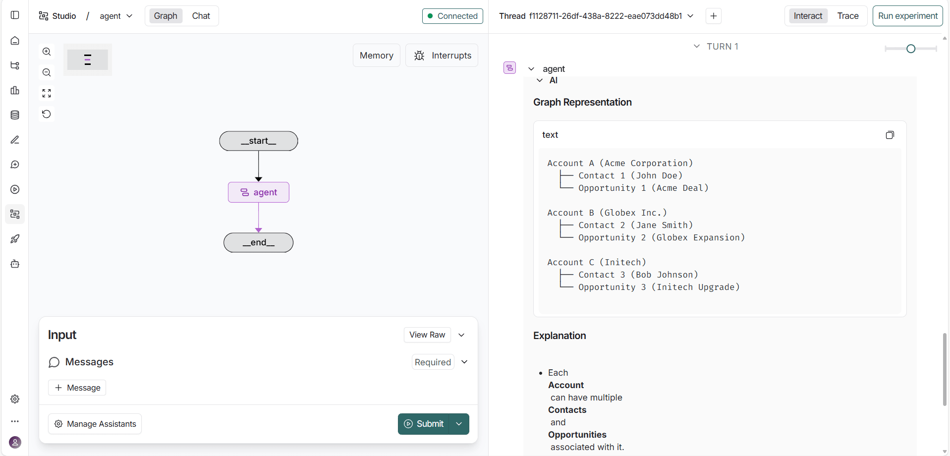 LangGraph displays a real-time visualization of the agent's reasoning flow, showing how it interprets the prompt, calls the appropriate MCP tools, and retrieves live data from Workday.